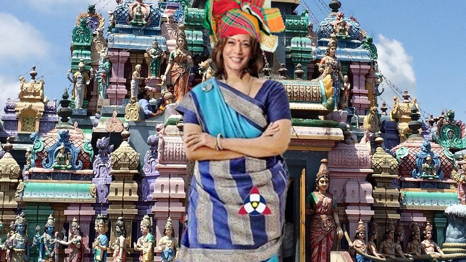 Kamala’s image in an Indian sari and a Jamaican head decoration for women symbolize her heritage.